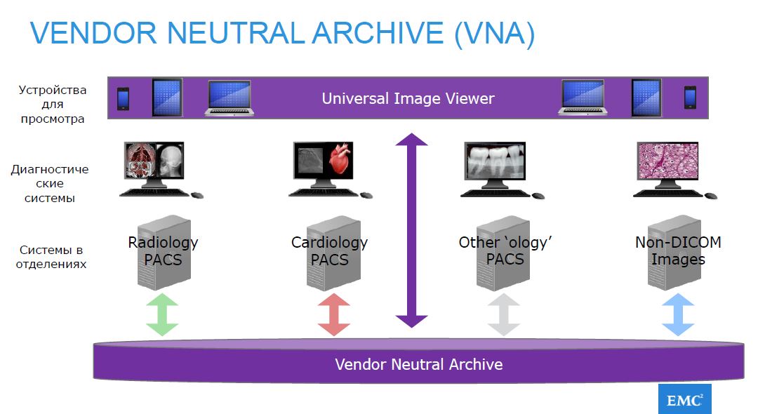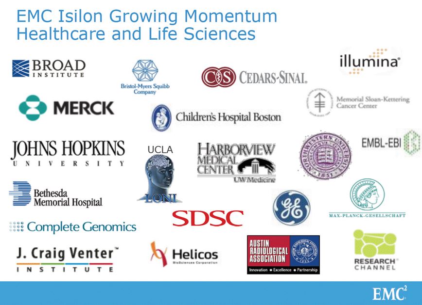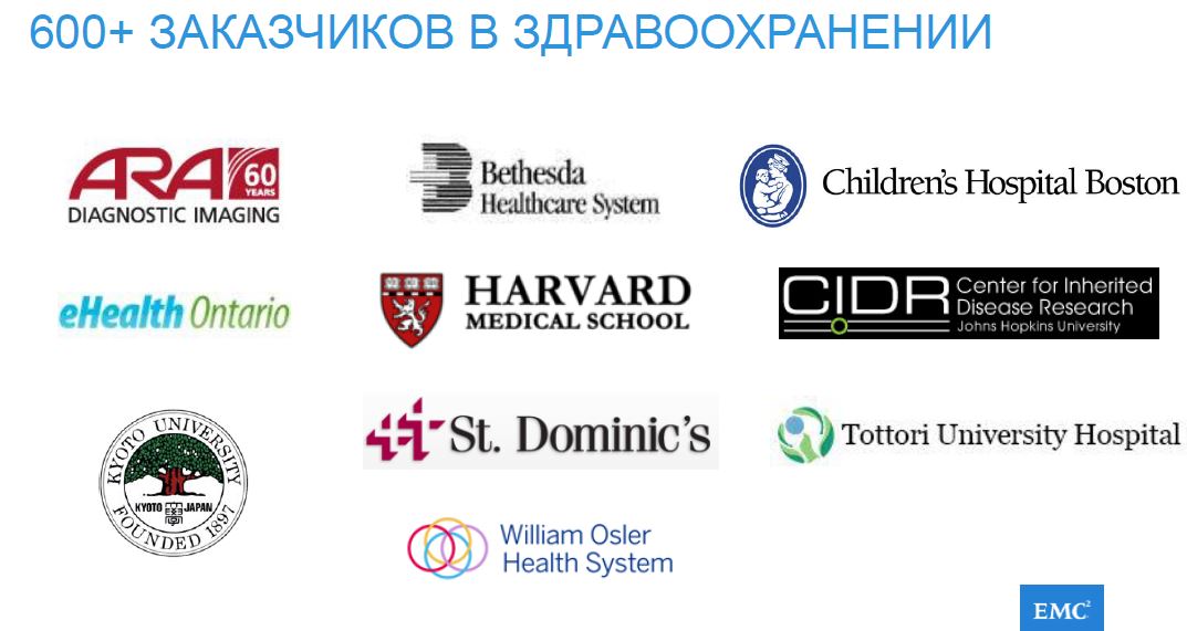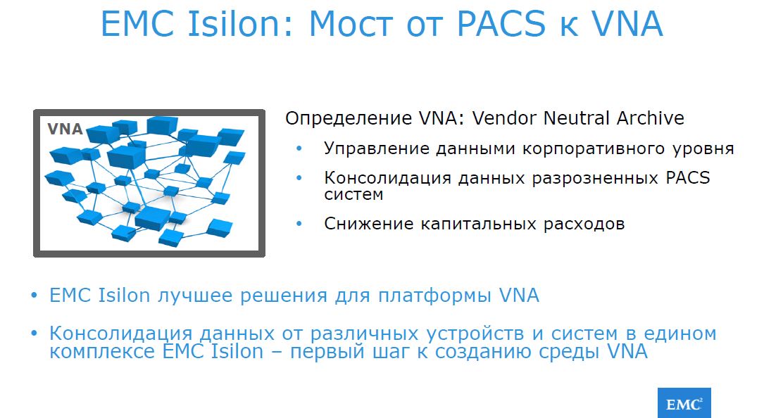 Горизонтально масштабируемая сетевая система хранения данных EMC Isilon может совместно использоваться отдельными подразделениями для системы передачи и архивирования изображений (PACS), обеспечивая безопасное управление хранением медицинских изображений без риска простоев и без ограничений, накладываемых размерами томов.