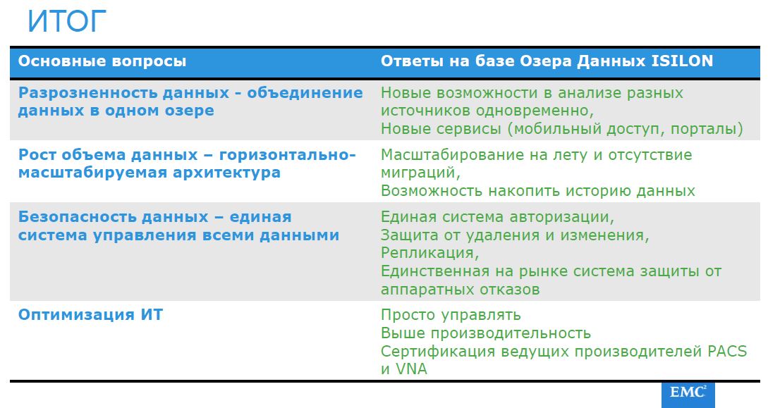 Больницы и другие организации здравоохранения могут снизить затраты и повысить эффективность эксплуатации, консолидировав изображения из системы передачи и хранения изображений разных отделений в единой, унифицированной, независимой и горизонтально масштабируемой сетевой системе хранения данных EMC Isilon.